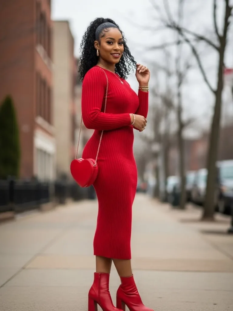 This outfit features a fitted red ribbed midi dress that hugs the body beautifully and shows off natural curves. The long sleeves keep it sleek while red ankle boots and a heart shaped bag add a playful Valentine touch. The monochrome red look feels bold and eye catching without needing much else. The vibe is confident, flirty, and very on theme.