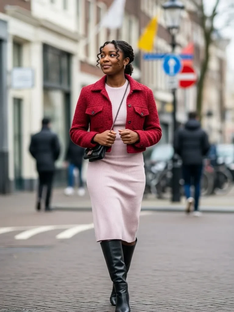 This outfit combines a soft blush fitted dress with a textured cropped red jacket for a layered Valentine look. The jacket adds structure while the dress keeps everything feminine and smooth. Knee high black boots bring contrast and make the outfit feel city ready. The overall vibe feels stylish, balanced, and effortlessly put together.