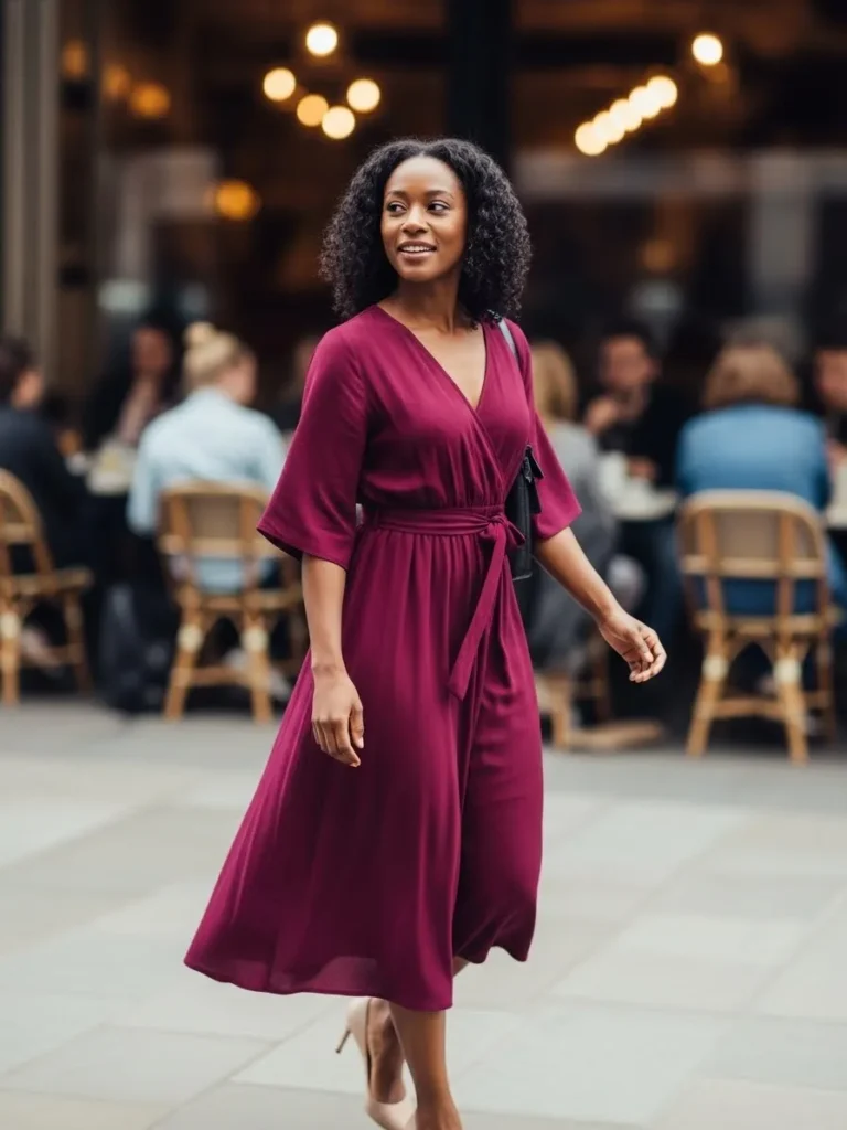I love how this kind of wrap dress always feels effortless but still very put together. The waist detail creates shape in the most flattering way and the flow of the skirt adds movement that looks amazing in real life. It feels feminine without being overdone and that deep burgundy tone always gives Valentine energy without screaming red.