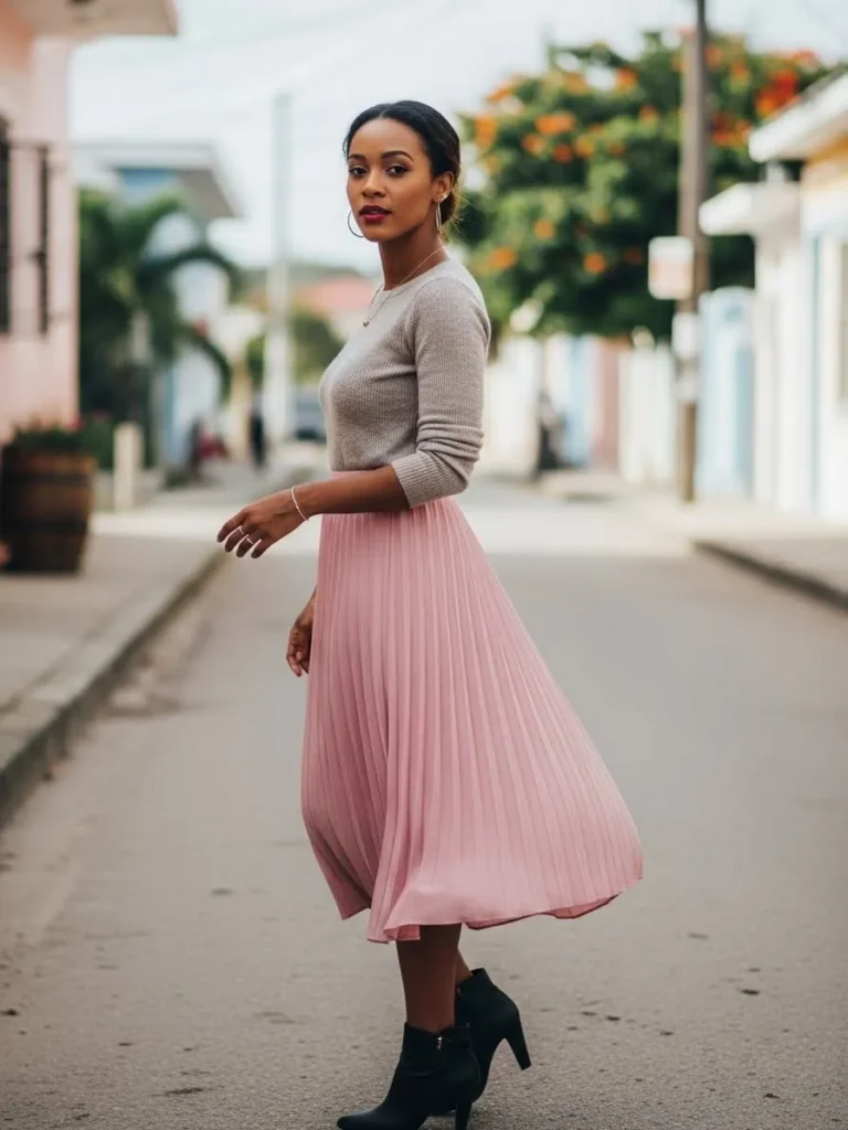 This look features a pleated blush pink midi skirt paired with a fitted neutral knit top. The skirt has beautiful movement and texture while the top keeps things simple and clean. Ankle boots ground the outfit and add a slightly edgy contrast to the softness. The vibe feels romantic but still casual and wearable.