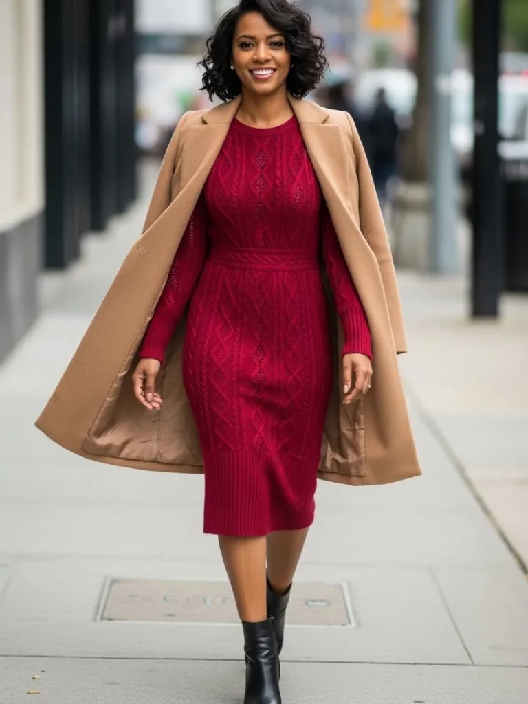 This look centers around a rich red knit midi dress layered with a timeless camel coat for a chic city ready Valentine outfit. The knit dress has subtle texture and a fitted shape that highlights curves beautifully while staying elegant. Black ankle boots keep the outfit grounded and practical without taking away from the romance. The overall vibe feels confident, classic, and perfect for a Valentine date in the city.