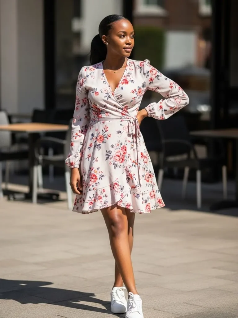 I love how this look mixes romance with comfort. The wrap style is always flattering and the sneakers make it feel real and effortless. It is ideal for someone who wants to feel pretty but still walk around comfortably all day.
