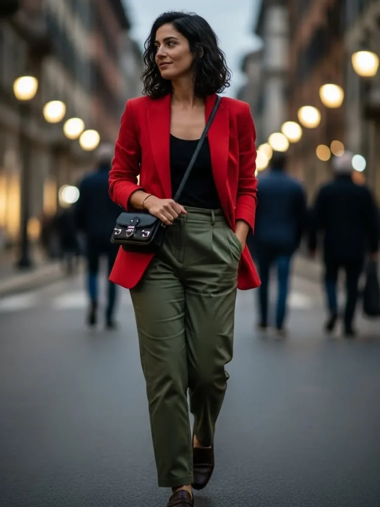 This outfit pairs a bold red blazer with a simple black top and relaxed olive green trousers.