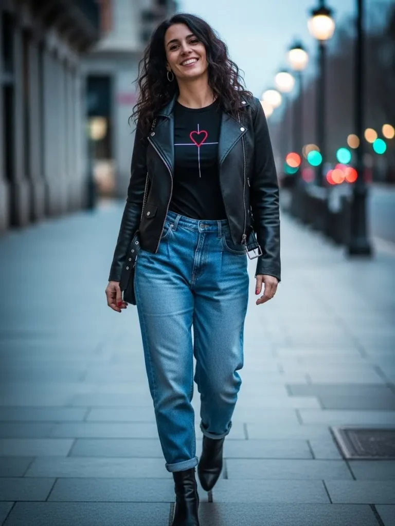 This outfit features a black leather jacket layered over a graphic tee with a subtle heart design, paired with relaxed jeans and ankle boots.