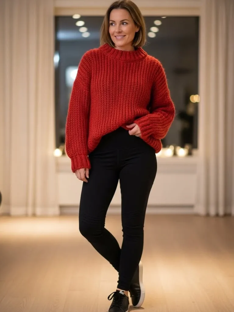 This outfit keeps things cozy with a chunky red knit sweater paired with fitted black leggings and sporty sneakers.