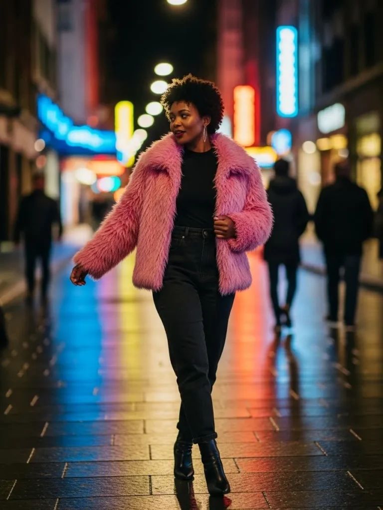 This outfit features a fluffy pink faux fur jacket layered over a simple black top, black jeans, and sleek ankle boots.