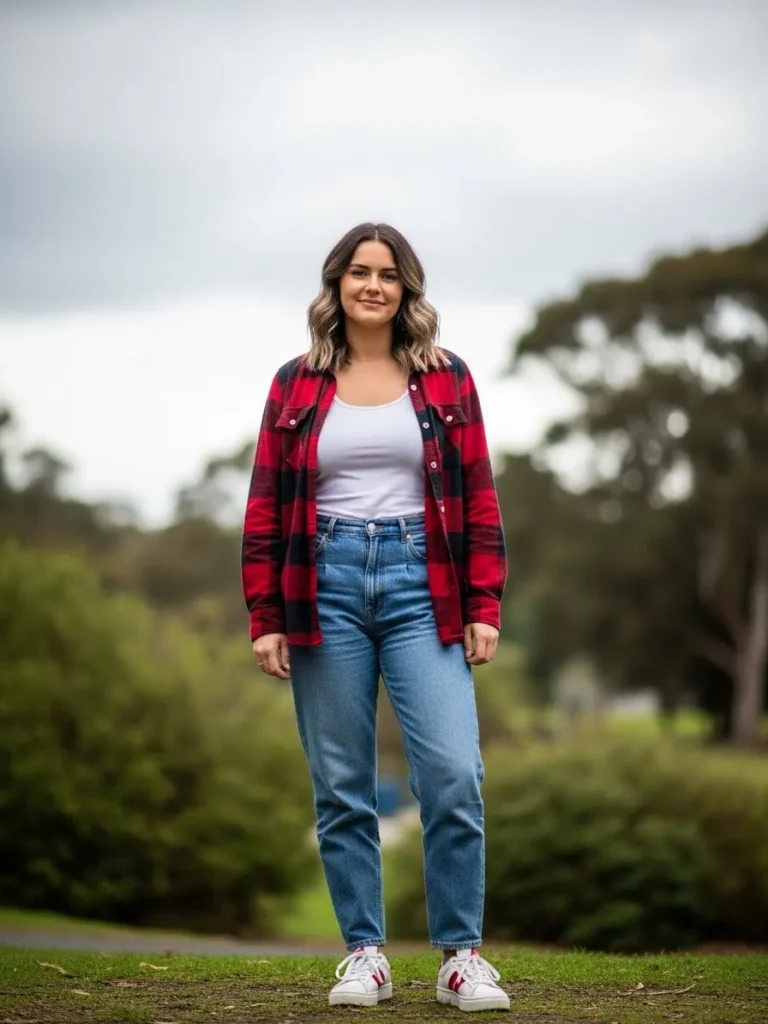 This outfit keeps things simple with a red plaid shirt layered over a white tank and classic blue jeans.