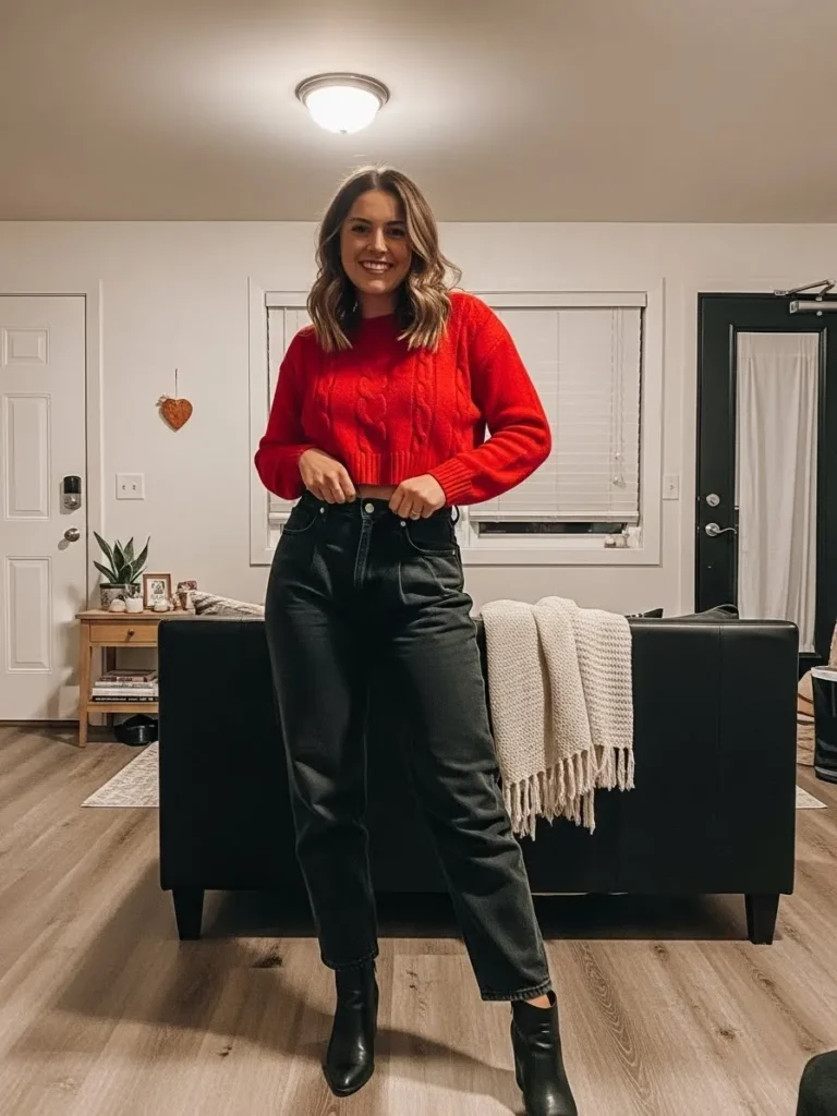 This outfit pairs a bright red knit sweater with relaxed black jeans and simple black ankle boots.
