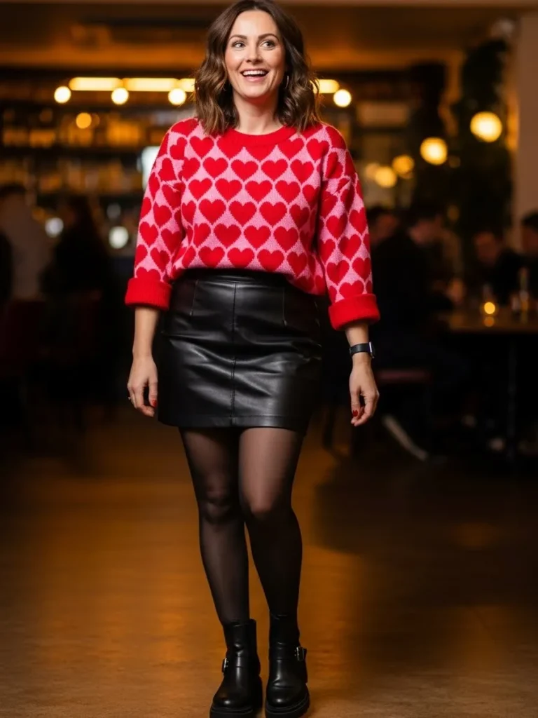 This outfit makes a statement with a red heart print sweater paired with a black leather mini skirt and ankle boots.