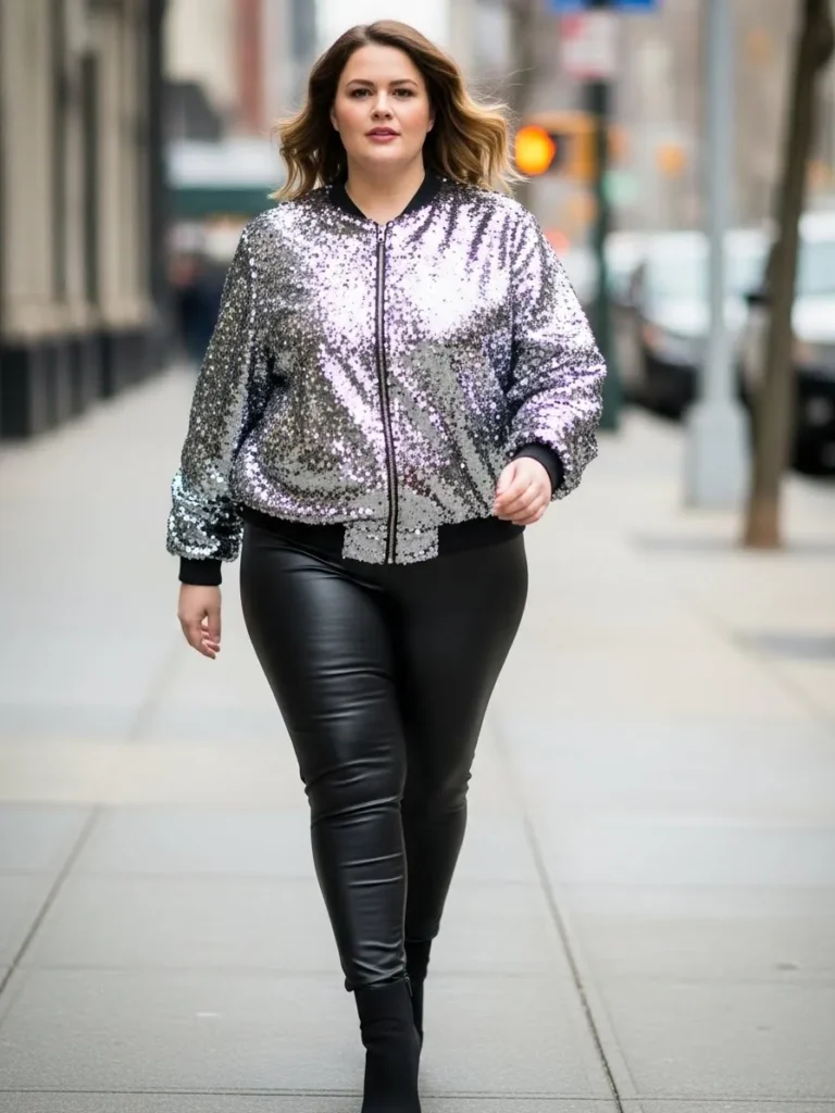 This outfit is all about high shine and easy confidence. The silver sequin bomber jacket does all the talking with its bright sparkle and soft reflective shimmer that catches light from every angle. It pairs so well with the black faux leather leggings that add a smooth and polished texture. The whole look feels bold and modern with that perfect blend of street style energy and New Year’s Eve sparkle.