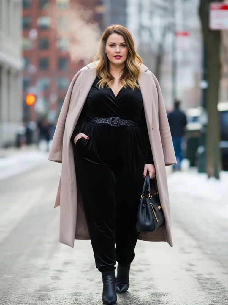 This look pairs a plush black velvet jumpsuit with a flattering wrap neckline and a sparkly statement belt that pulls the waist in just right. The fabric has that rich winter softness that feels instantly festive. A long blush coat drapes over the shoulders and adds a soft contrast that keeps the outfit feeling luxe. Black ankle boots and a structured handbag finish everything off with clean polish. The whole vibe feels warm, elegant and effortless in that confident New Year’s Eve way.
