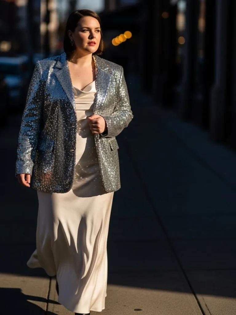 This look pairs a gleaming silver sequin blazer with a soft champagne satin slip dress that flows beautifully with every step. The blazer catches every bit of light in the most magical way while the dress brings in that silky, elegant contrast that makes the whole outfit feel luxe without even trying. The mix of textures feels rich and winter party ready and the warm street lights in the background give it that perfect New Year’s Eve sparkle.