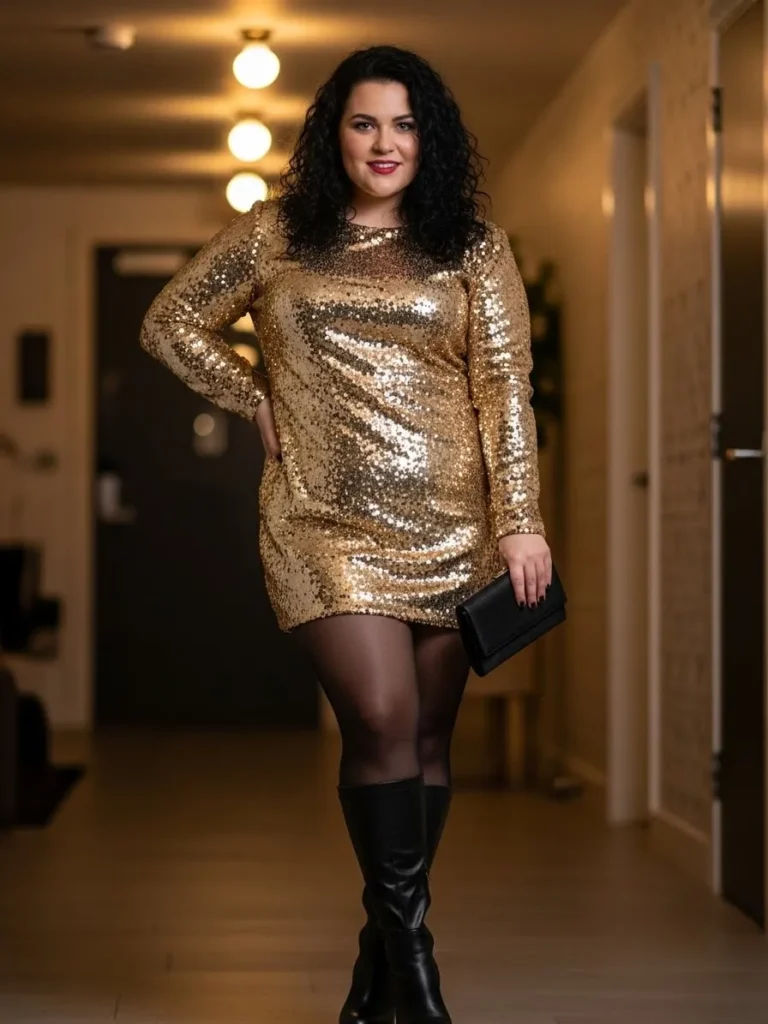 I love this outfit because it feels like the perfect mix of sparkle and comfort. The long sleeves make it feel winter friendly while the sequins bring that unmistakable celebratory energy. The boots help ground the look so it never feels too dressy or over the top, and the black accessories let the gold shine like the main character it deserves to be. It is one of those outfits that instantly makes you stand taller and feel like the star of the night.