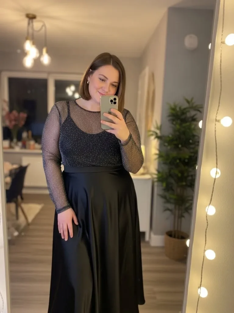 This look mixes a gorgeous shimmery sheer top with a fitted sparkly tank underneath and a flowy black satin skirt that catches the light in the prettiest way. The combination of soft glitter mesh and smooth satin creates that perfect New Year’s Eve energy while still feeling classy and comfortable. The whole outfit gives off a polished party vibe with a little extra glow thanks to the subtle sparkle through the sleeves and bodice.