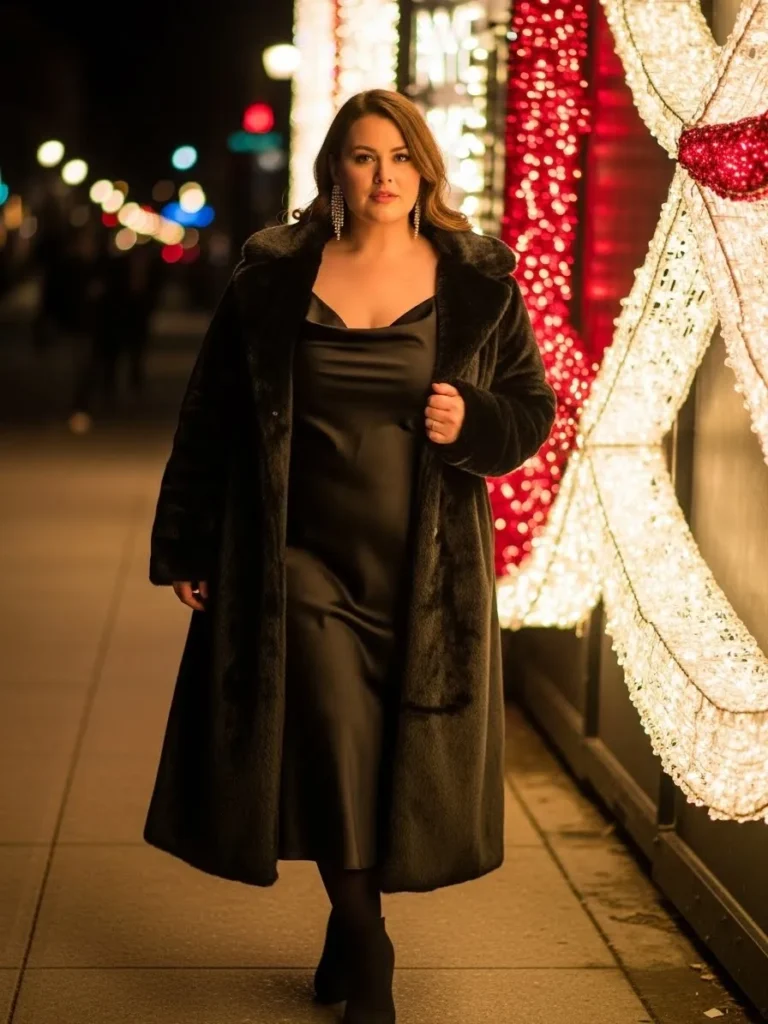 This look is all about luxurious simplicity with a festive twist. A silky black slip dress creates that smooth and elegant base while the long black faux fur coat brings in instant winter glamour. The coat adds texture and drama that pairs so well with the soft shine of the dress. Statement crystal earrings catch the holiday lights beautifully and the black tights and boots keep everything streamlined. The whole vibe feels like old Hollywood meets New Year’s Eve sparkle with a modern plus size twist.