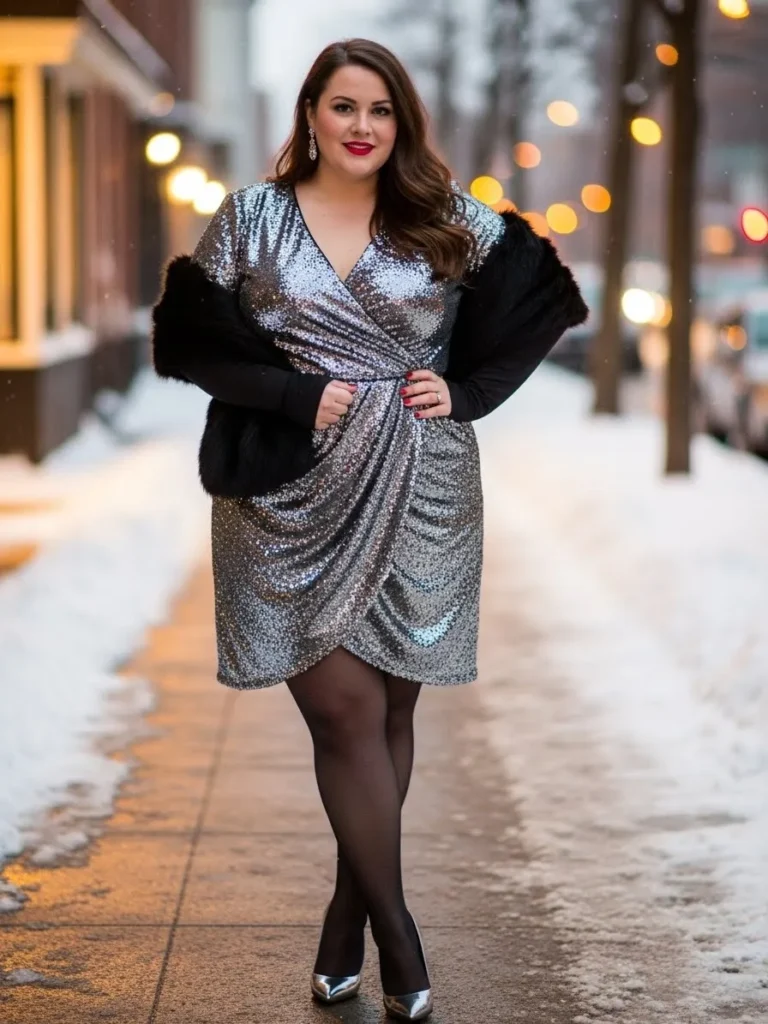 This outfit is the definition of New Year’s Eve magic with its silver sequin wrap dress that catches every bit of light in the prettiest way. The draped front gives it that glam goddess vibe while the V neckline keeps things flattering and feminine. I love how the black faux fur shawl adds the perfect winter touch without covering up the shimmer. The sheer black tights and metallic heels tie everything together with a sleek finish that feels totally party ready.