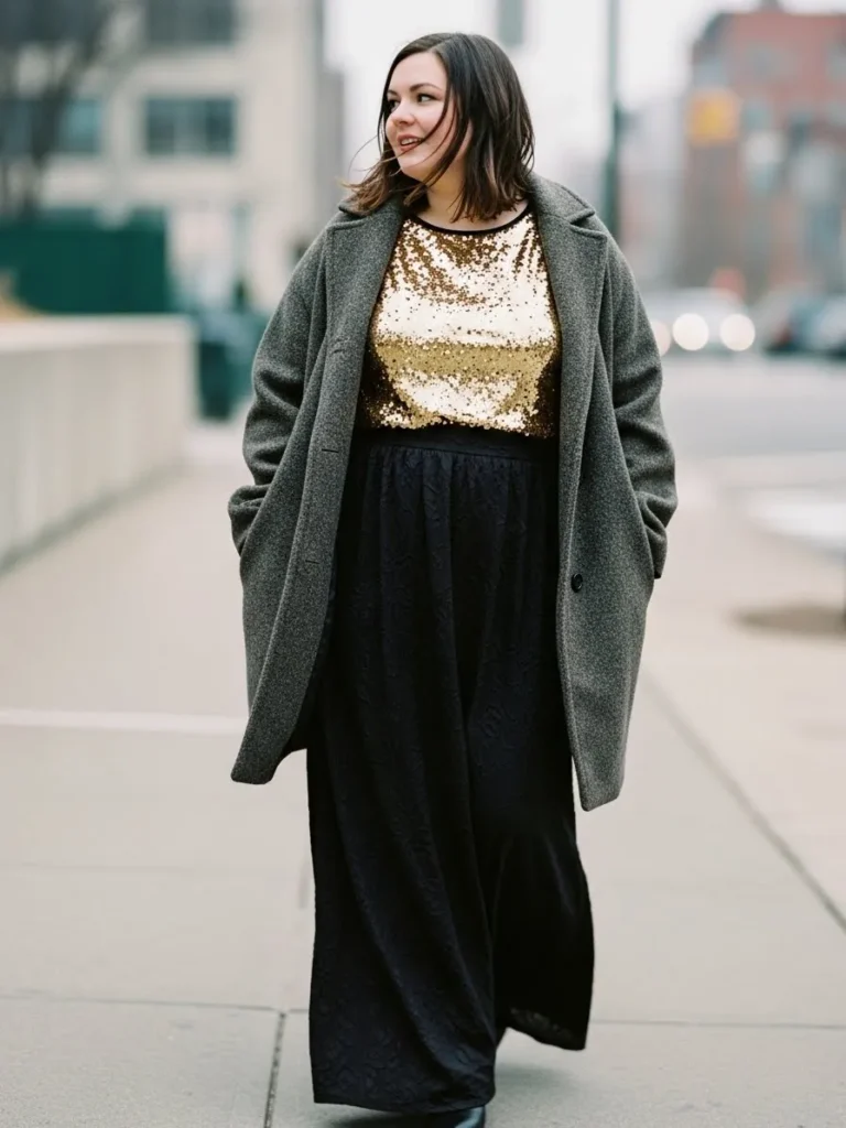 This outfit pairs a shimmering gold sequin top with a flowy black maxi skirt that moves so beautifully with every step. The sparkles sit under a relaxed charcoal gray wool coat that adds warmth without hiding the shine. The whole look feels festive and effortless at the same time thanks to the mix of glam textures and comfy layers. It is the perfect blend of sparkle on top and soft sophistication on the bottom.