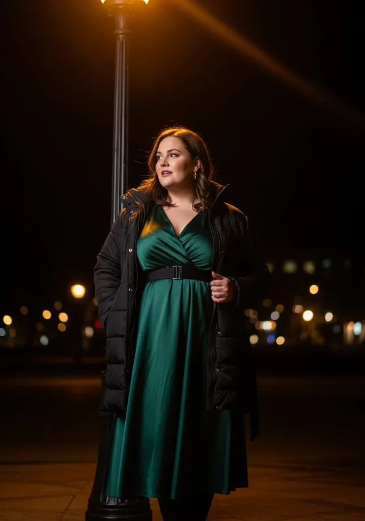 This look pairs a gorgeous deep green wrap style midi dress with a sleek belted waist that instantly creates that effortless hourglass shape we all adore. The fabric has a soft sheen that catches the warm streetlight glow beautifully. On top she adds a black quilted puffer coat that feels practical for winter nights but still polished enough for a dressy moment. The dark backdrop and glam lighting give the outfit a romantic city night vibe with just the right amount of mystery.