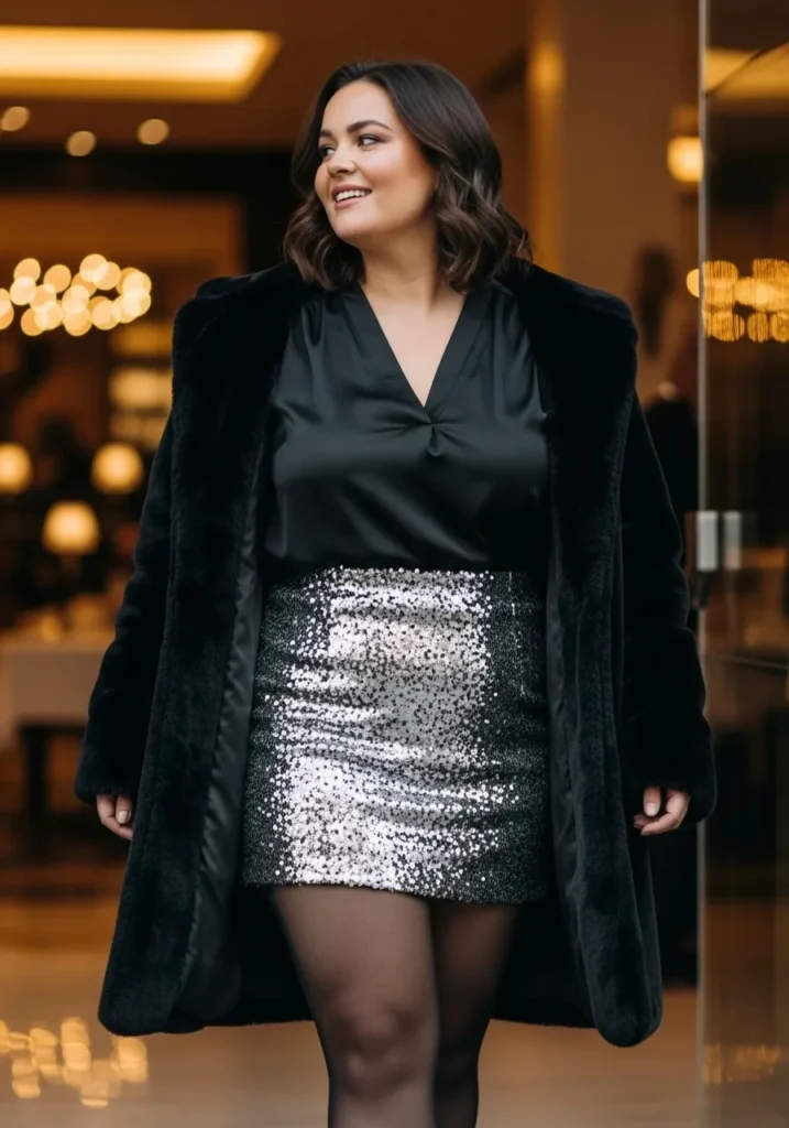 This outfit is such a perfect mix of glam and winter polish. The silky black V neck blouse brings a soft shine that feels instantly dressy, and pairing it with a silver sequin mini skirt turns the whole look into a full sparkle moment. The black faux fur coat adds that plush winter drama that makes the outfit feel warm and luxurious at the same time. With sheer black tights and the cozy texture of the coat framing the shimmery skirt, the whole vibe feels festive, sleek and confidently glamorous.