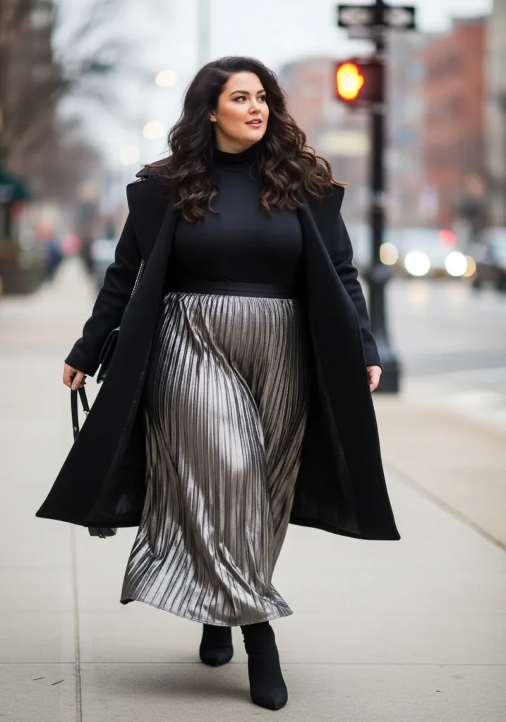 This outfit mixes winter chic with a little city shimmer. The black turtleneck creates a smooth, sleek base that pairs beautifully with the long black coat, giving everything that polished cold weather vibe. The real star is the silver metallic pleated skirt which catches the light with every step and moves in the prettiest swishy way. Black ankle boots keep the look grounded and practical for chilly nights, while the soft waves and subtle glam makeup add just the right touch of elegance.