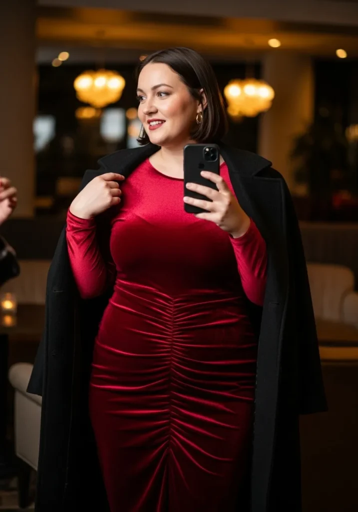 This look is all about rich winter glamour with a little bit of attitude. The deep red velvet dress hugs the body in the softest way and has that gorgeous ruched detailing down the front that instantly shapes everything beautifully. The long sleeves add a cozy winter touch while still keeping the vibe dressy. I love how she has a classic black coat casually resting on her shoulders because it adds that effortless confidence, almost like she just stepped out of a chic downtown lounge for a quick photo moment. The gold hoops and the soft glam makeup keep everything warm and glowing.