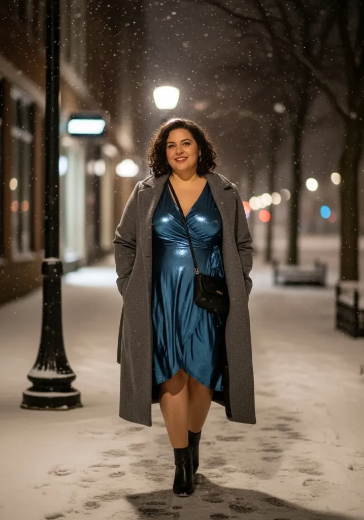 This look feels like pure winter romance with a little sparkle. The rich blue satin wrap dress steals the spotlight instantly with its glossy finish and flattering crossover neckline. Paired with a long gray wool coat, the whole outfit feels warm but still so dressy, almost like she stepped straight out of a cozy holiday movie scene. The black ankle boots and small crossbody bag keep things practical for snowy sidewalks while still looking chic. The soft glow of the streetlights hitting that satin fabric adds the prettiest shimmer and makes the entire look feel effortlessly glam.