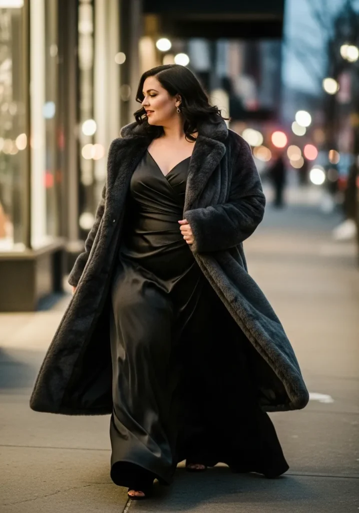 This look is pure winter nightlife magic. The outfit pairs a sweeping black satin gown with a flattering wrap style that catches the light with every step. The fabric flows beautifully, giving that soft liquid sheen we all secretly want in a dress. On top of that, the plush charcoal faux fur coat adds the kind of drama that makes people turn their heads before they even realize they’re doing it. The whole vibe feels like old Hollywood glamour meeting modern city confidence, and honestly, it’s flawless.