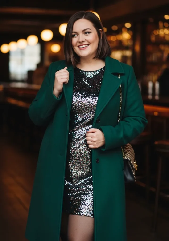 This look pairs a deep emerald green coat with a black and silver sequin mini dress that absolutely loves the spotlight. The coat has that polished, tailored structure that instantly makes everything underneath feel more luxurious, while the sequins add a fun, party-ready glow. The length of the coat balances the shorter hem of the dress in such a chic way, and the little gold chain bag brings just the right hint of glam without fighting for attention. The whole vibe feels warm, confident, and ready for a night that ends with compliments from strangers.
