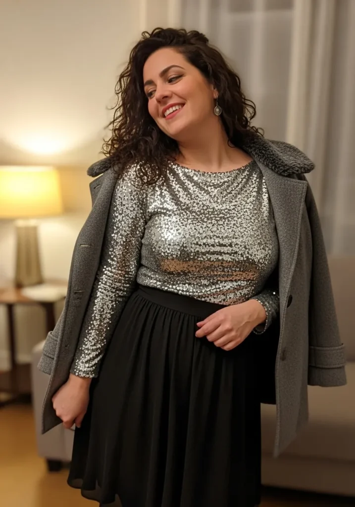 This outfit feels like the perfect mix of shimmer and warmth. The silver sequin top brings that gorgeous party glow, and it pairs beautifully with the flowy black skirt that moves so softly. The grey wool coat draped over the shoulders adds a cozy touch without taking away from the glam. The whole look feels polished and festive, with the sequins catching the light in such a flattering way.