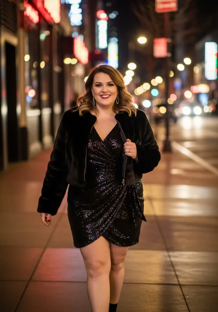 This look brings together a glittery black mini dress with a flattering gathered wrap detail and a plush faux fur jacket that feels rich and warm at the same time. The dress catches every bit of light in the city glow, giving that perfect shimmer effect without feeling over the top. Paired with soft waves, a bold red lip, and statement earrings, the whole outfit leans into that confident winter glam vibe that feels made for nights when you fully intend to steal the spotlight.