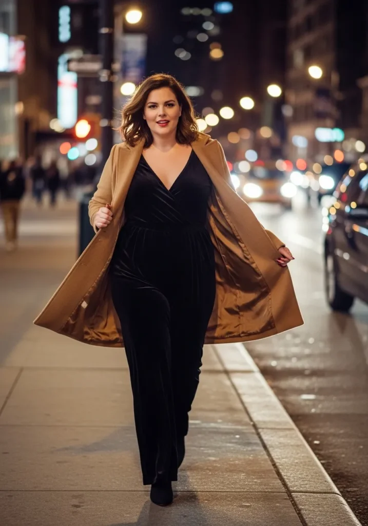 The outfit feels luxe and effortless with a sleek black velvet jumpsuit that hugs in all the right places. The soft V neckline adds just enough drama while still staying classy for a winter night out. Layered over it is a warm camel coat that moves beautifully with each step and brings a polished contrast to the dark velvet. The whole look has that chic city evening vibe with clean lines, rich textures, and a touch of quiet glamour.