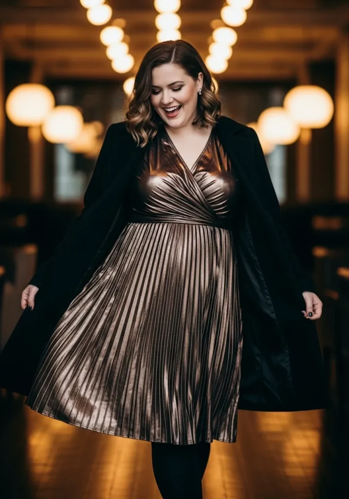 This look brings together a shimmering bronze pleated dress with the prettiest wrap neckline that catches every bit of light in the room. The fabric has that liquid metallic vibe that moves beautifully with each step, giving the whole outfit a soft sparkle. Paired with a sleek black coat and opaque tights, the look feels perfect for winter nights when you want warmth without losing the glamour. The whole outfit sits in that dreamy sweet spot between elegant and fun, which makes it an instant showstopper for any evening event.