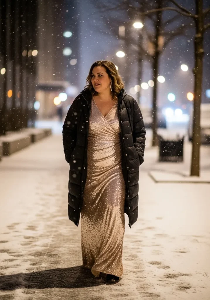 This look pairs a stunning champagne sequin gown with a long black puffer coat that feels both practical and completely glamorous. The gown catches every bit of city light with its shimmering fabric and soft draped silhouette. The deep V neckline adds a flattering touch while the floor length shape brings full red carpet energy. The black puffer coat gives it that perfect winter twist so the whole outfit feels chic in a snow-kissed city moment. The overall vibe is elegant but still grounded and effortless.