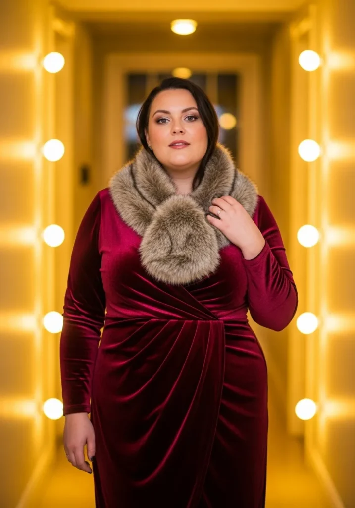 This look features a stunning deep burgundy velvet dress that immediately gives rich winter goddess energy. The fabric catches the light in the softest way and the wrap detailing adds that beautiful sculpted shape we all adore. The star of the outfit has to be the plush faux fur scarf in a soft champagne brown shade. It feels lavish without trying too hard and instantly turns the whole look into a dressy night moment. The warm golden lighting around her makes the entire vibe feel like walking backstage at a glamorous holiday gala.