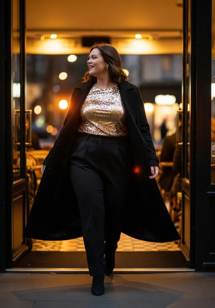 This outfit is such a gorgeous mix of sparkle and structure. The gold sequin top instantly catches the light and gives that glowy party vibe, while the long black coat adds an elegant layer that feels both warm and dramatic. The tailored black trousers keep everything sleek and polished, and the heeled boots pull the whole look together with that quiet confidence you get from a monochrome base. The overall effect is chic city evening energy with just the right amount of shimmer.