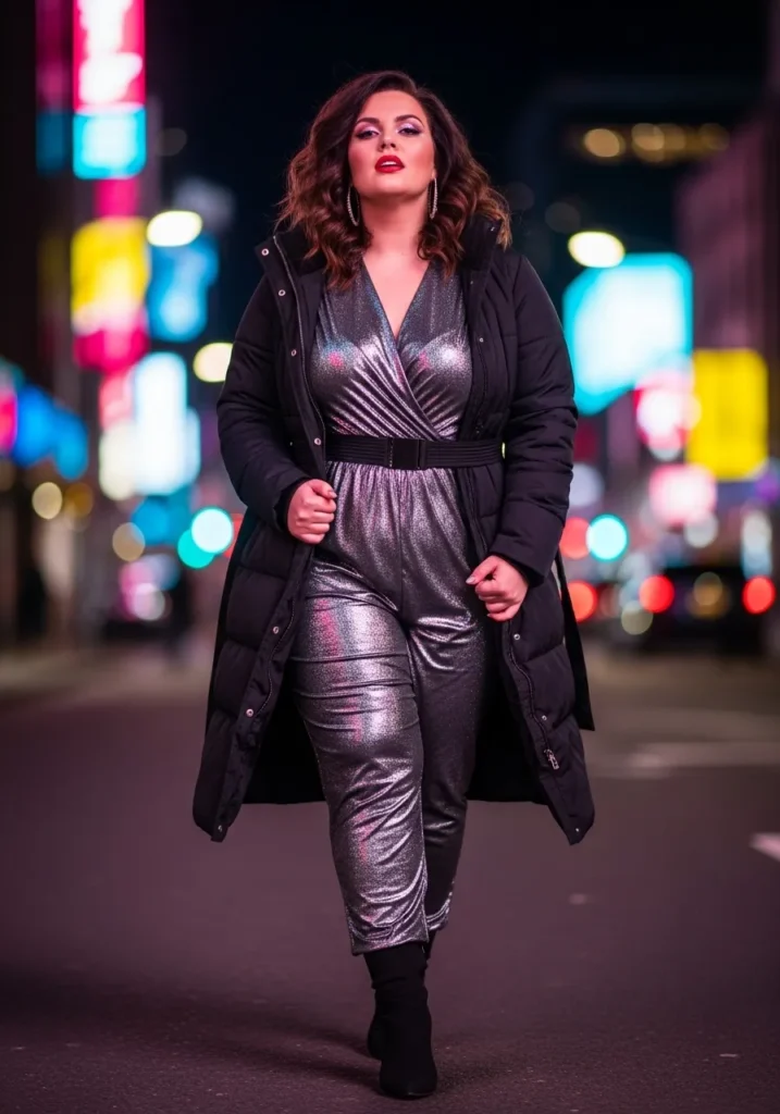 I love how this outfit blends practicality and drama. The puffer keeps everything cozy, yet the silver jumpsuit does all the talking and then some. The wrap neckline feels so flattering on curves and the belted waist pulls the whole look together. It is one of those outfits that makes me feel unstoppable while still staying warm, which honestly feels like a winter miracle.