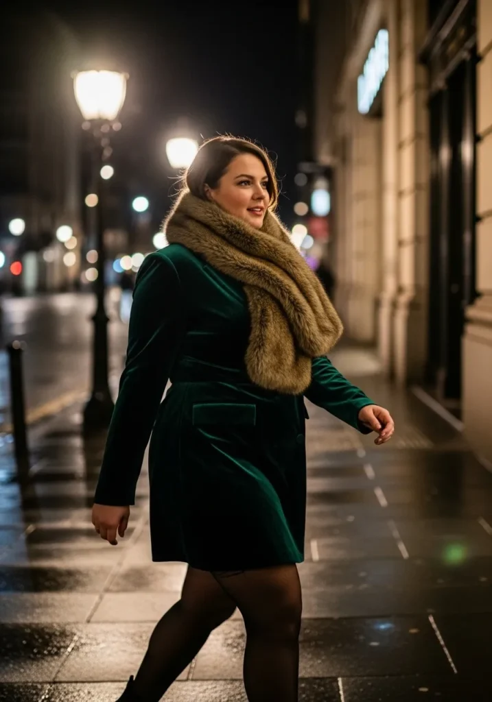 This look blends rich winter glamour with that cozy luxe feeling we all want on a chilly night out. The deep emerald velvet dress creates a gorgeous soft sheen that catches every streetlight. The long sleeves keep things warm while the structured silhouette adds shape without feeling stiff. The oversized faux fur scarf brings drama and comfort at the same time. The texture contrast between the plush velvet and the fluffy wrap feels so indulgent. Paired with sheer tights and sleek ankle boots, the whole outfit gives off polished old-Hollywood energy with a modern winter twist.