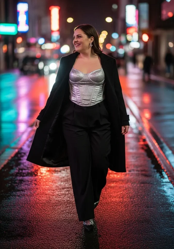 This look is the kind of winter night outfit that instantly feels like a main character moment. The silver metallic corset adds a gorgeous sculpted shine that catches every bit of city light. Paired with tailored black wide leg pants, the whole outfit feels sleek and modern while still giving plenty of comfort. The long black coat brings in that warm winter layer without stealing any attention from the shimmer underneath. The overall vibe is confident, bold, and made for nights when the streets are wet, the lights are glowing, and you fully intend to be seen.
