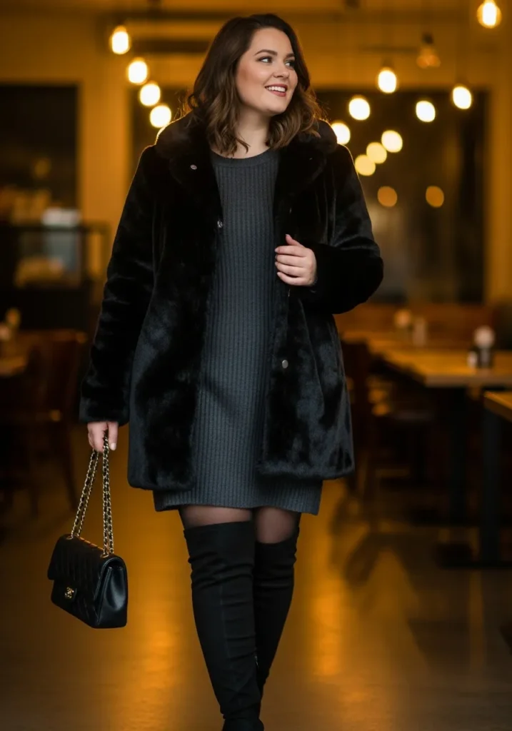 I love this outfit because it feels elevated without being fussy. The faux fur coat makes me feel a little glamorous, and the knit dress keeps everything comfortable. The boots help create a long, smooth line that always feels flattering on me. It is one of those looks that makes me feel warm, confident, and ready for anything winter throws my way.