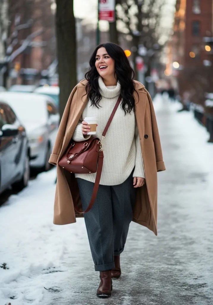 I love how this outfit feels stylish without asking for too much effort. The mix of soft neutrals keeps everything chic and clean, while the oversized knit adds that cozy feeling I want on cold mornings. The camel coat ties it all together and honestly makes me feel like I have my life together even when I absolutely do not. The relaxed trousers are flattering and comfy, and the warm brown accessories keep the whole look grounded. It is one of those winter outfits that just works every single time.