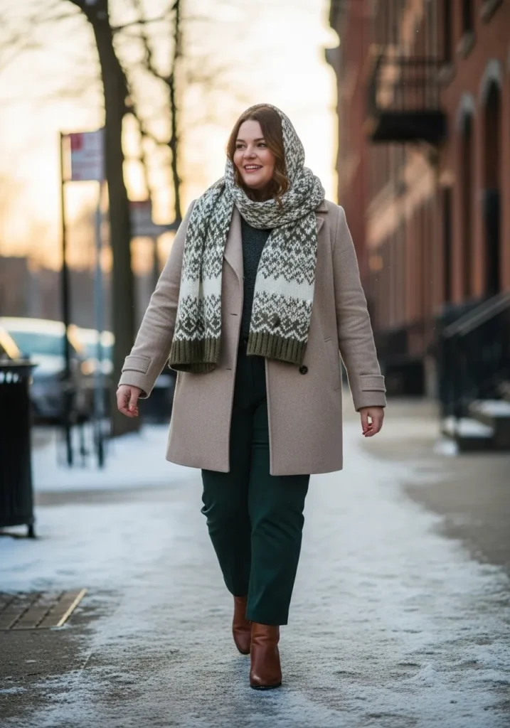 This outfit brings together the prettiest mix of winter textures and earth tones. She wears a soft beige wool coat that feels polished yet totally comfortable for chilly days. Underneath is a dark knit sweater that adds warmth without looking bulky. The forest green trousers make the whole look feel rich and seasonal. The star is the oversized patterned scarf in cream and olive that wraps around her neck and hood. Brown ankle boots finish everything with a classic touch. The whole vibe is relaxed, warm, and effortlessly put together.