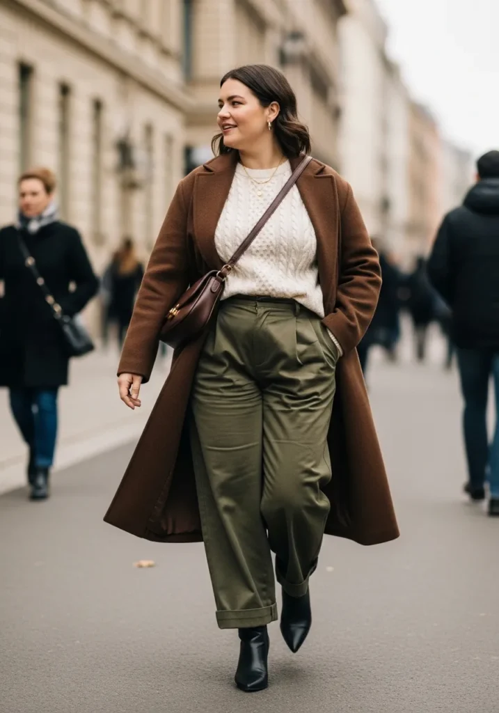This outfit brings together all the winter classics in the prettiest, most effortless way. The long chocolate brown coat instantly adds warmth and polish, layered over a soft cream cable knit sweater that feels perfectly cozy without looking bulky. The olive green high waisted trousers create a gorgeous color combo with the coat, and the relaxed pleated fit gives the whole look a modern city chic vibe. Black ankle boots sharpen the outfit just enough, and the small crossbody bag adds that quiet luxury touch everyone loves right now.