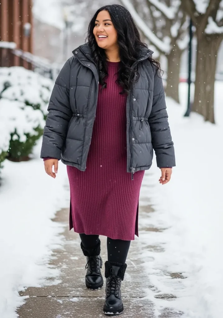 This look pairs a charcoal puffer jacket with the softest vibe ever and a gorgeous berry colored ribbed sweater dress that hits right below the knee. The dress has a straight silhouette with little side slits that make it easy to move in, and the rich knit texture looks so warm and winter ready. Black leggings keep everything smooth and snug while the black lace up winter boots add that practical snow day touch with their cozy faux fur trim. The whole outfit feels polished but still totally comfortable for a frosty morning walk.
