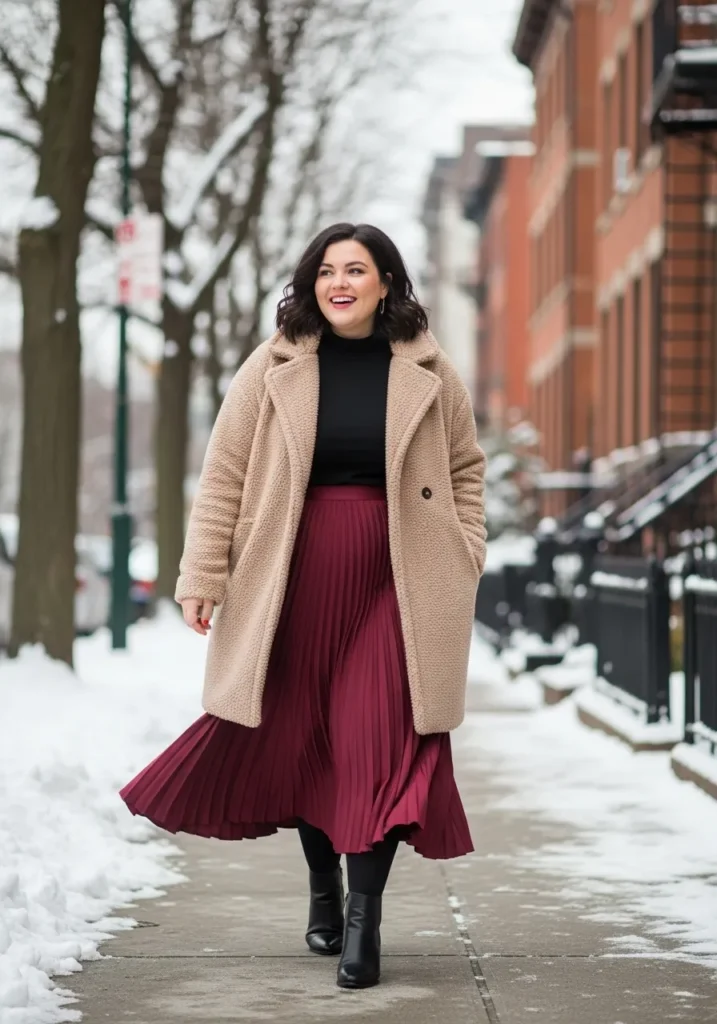 This look pairs a soft beige teddy coat with a classic black turtleneck and a flowing burgundy pleated midi skirt. The mix of cozy texture on top and feminine movement on the bottom creates such an elegant winter vibe. Black heeled ankle boots finish the outfit with a clean modern touch while keeping it practical for cold sidewalks. The colors feel warm and rich which makes the whole outfit feel polished without trying too hard.