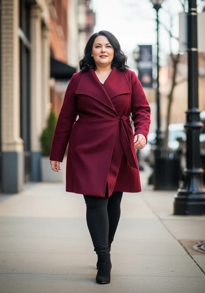 This look is all about effortless polish. The rich berry colored wrap coat steals the spotlight with its soft structured fabric and clean wrap silhouette that ties neatly at the waist. The color feels warm and luxurious, perfect for brightening a cold winter day. Paired with classic black leggings and sleek black ankle boots, the whole outfit feels streamlined and city chic. The coat’s length and drape create a beautiful flow while still keeping things cozy and practical for everyday wear.