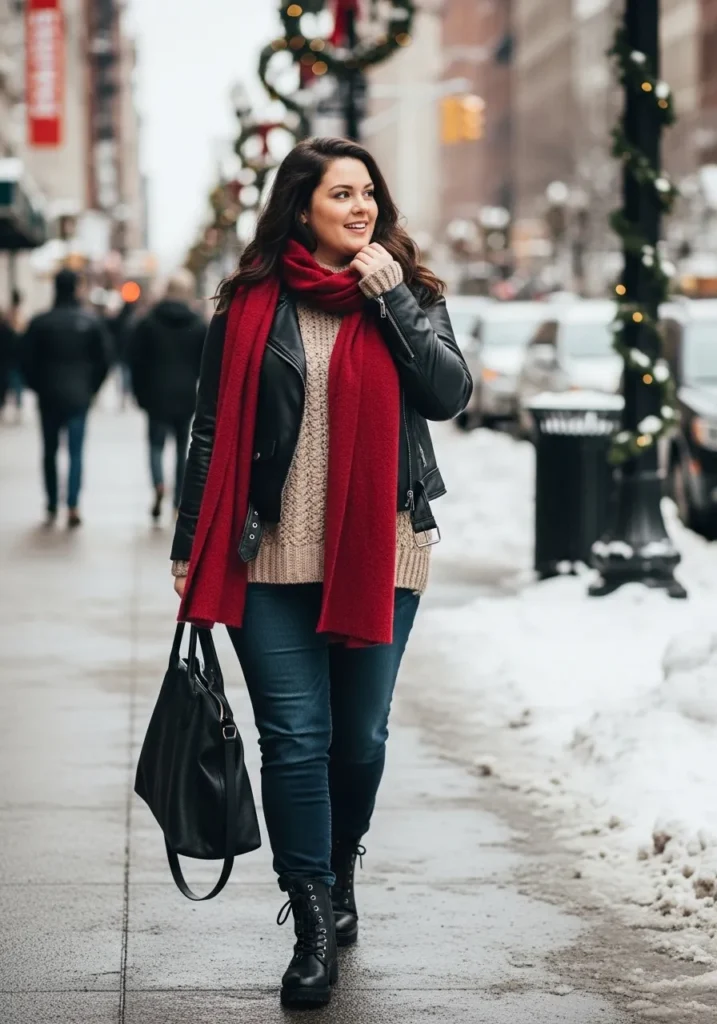 This look mixes all the winter essentials in the most effortlessly cute way. She pairs a soft chunky beige sweater with a classic black leather jacket that gives the whole outfit a little downtown edge. The rich red scarf becomes the star of the look, adding warmth and that perfect pop of color against the snowy backdrop. Dark skinny jeans and sturdy black lace up boots keep everything practical for icy sidewalks, and the roomy black tote makes it easy to carry all the cold weather extras. The whole vibe feels warm, stylish, and totally ready for a winter day in the city.