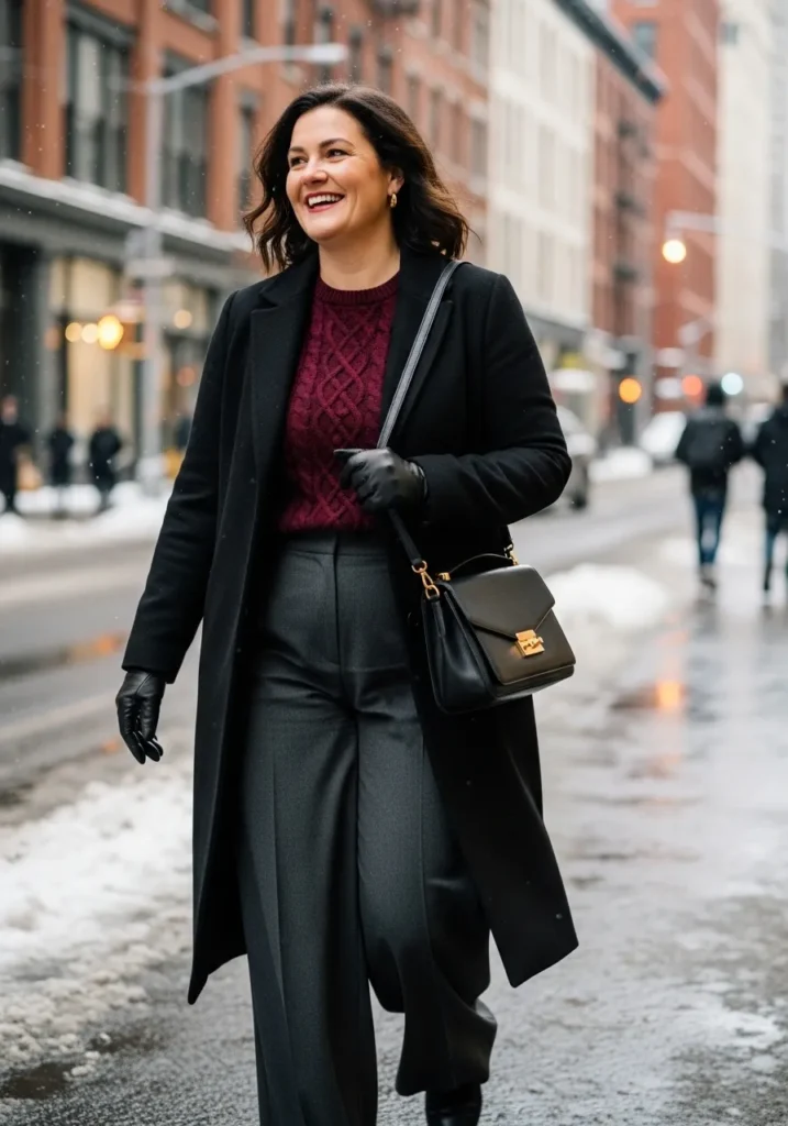 This outfit pairs a rich burgundy cable knit sweater with tailored charcoal wide leg trousers that create such a clean and polished line. The look is finished with a long black wool coat that adds instant sophistication while keeping everything warm against the winter chill. Black leather gloves and a structured black shoulder bag with gold hardware add a touch of elegance without feeling too formal. The whole vibe feels effortless and city ready with just the right amount of cozy texture and sleek tailoring.