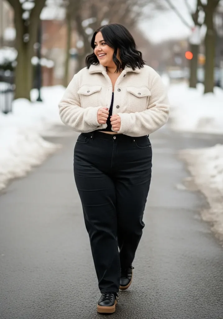 This outfit is the perfect blend of snuggly and polished. The cropped sherpa jacket in a soft cream tone looks warm enough to survive even the moodiest winter morning, and the fuzzy texture adds instant charm. Paired with high rise black jeans that fit smoothly through the hips and legs, the whole look feels clean and effortlessly balanced. The black sneakers with a beige sole keep things casual, comfy, and chic without trying too hard. The vibe is very winter weekend stroll while looking put together without sacrificing comfort.