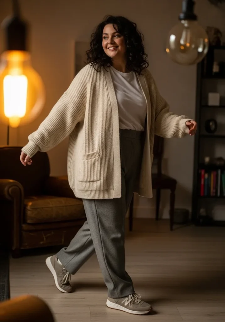 I love this kind of look because it proves you can feel comfy and still look like you tried. The oversized cardigan drapes in the most flattering way and the soft knit adds that cozy factor I always want in winter without swallowing the body. The trousers balance the volume on top so the outfit stays clean and put together. Plus the sneakers keep it practical for real life which honestly is always a win for me.