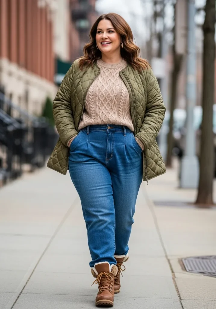 This look is all about easy comfort with a cute city girl vibe. The outfit pairs a soft cable knit sweater in a warm oat shade with classic medium wash high rise jeans that skim the body without feeling tight. The quilted olive green jacket brings that perfect touch of winter coziness while still looking put together. I also love the shearling lined lace up boots because they give the whole outfit a practical but polished feel for cold days. The mix of textures feels warm and inviting and the colors blend beautifully for a relaxed winter look.